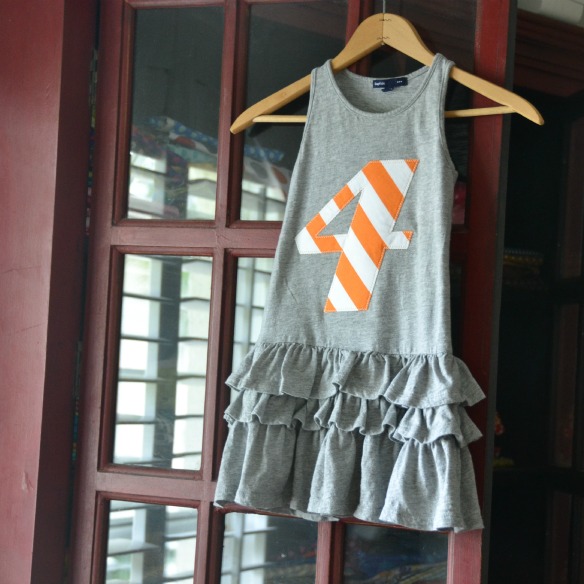 Speaking of Amish thread, I started and finished a sewing project today. I picked up this ruffled tank dress for Savannah at The Gap Outlet for under $10. I love these kinds of dresses, because you can layer them over a long tee, short tee, shorts, leggings, jeans, or just wear as is. But, it was a little too drab for my liking, so I hooked it up with a giant 4 appliqué! Check out my two part series here and here for help getting started in appliqué.