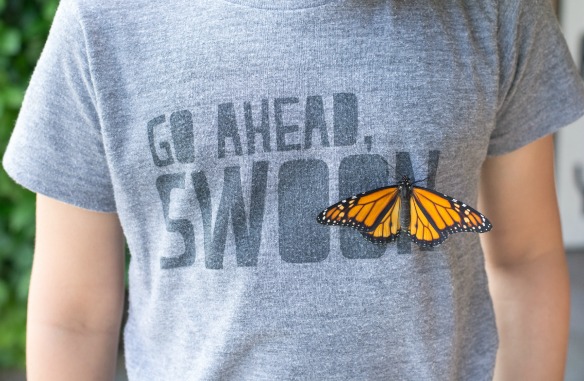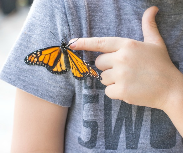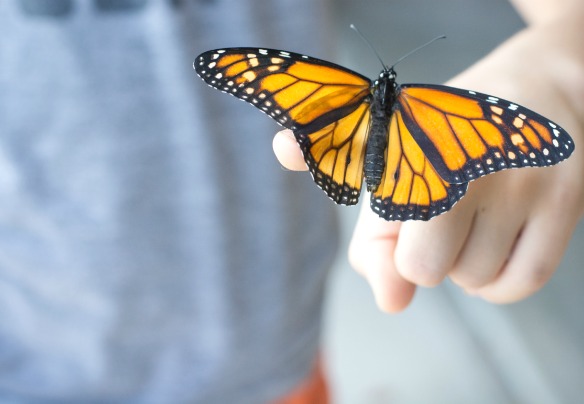 There is one winged creature I never tired of seeing. The Monarch. After our first Monarch release, we planted a ton of milkweed. We have momma Monarchs here just about everyday looking to lay their eggs. A lot of the caterpillars don’t make it, but this one did. We had fun letting him crawl up and down our arms yesterday. After about 2 hours, he finally took flight. No toddler throw down needed.