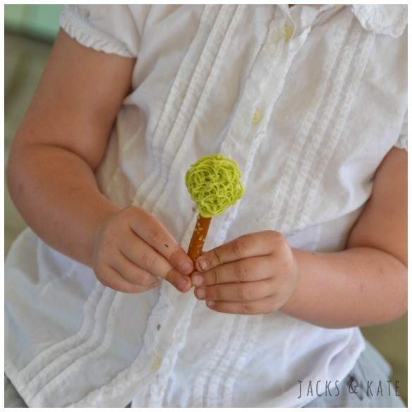 After Easter and my bunny food treats I shared with you last month, I had some leftover supplies. So, I was playing around with making pretzel trees for Earth Day on April 22nd. After a couple of failed attempts, I came up with this super simple earth food treat.