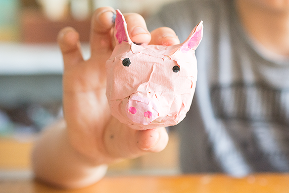Next, add the eyes and ears. You can choose just to paint the eyes on, but if you want to add some dimension, then just ball up a little piece of tape and attach with a layer of masking tape. For the ears, we used a cereal box. We drew out simple ear shapes, cut them out, then covered them in tape, and attached to the head with more tape. For the elephant trunk and ostrich neck, I formed the shape I wanted with a pipecleaner, then wrapped a piece of the plastic bag around it and secured it with masking tape. Also, because the shape has some give, you can manipulate it and add indentations for eyes, nostrils, etc.