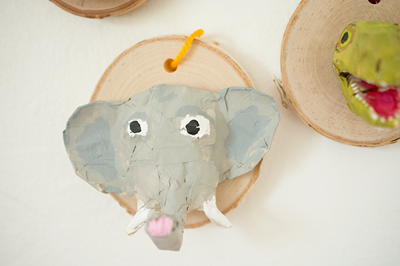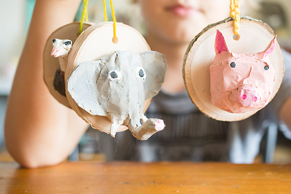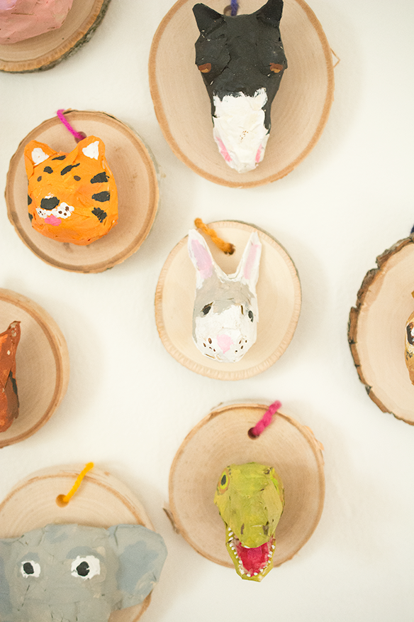 Once you have your head completed and covered in tape, you can start painting. This is where they really start to come to life. Depending on the paint color, you might need two coats. Set aside to dry. The wood slices do not come with a hole, so you’ll need to drill them out. After the paint has dried, glue the head to the wood slice, and thread a piece of yarn through the hole.