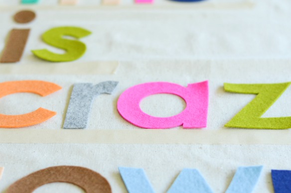 A while back, I was browsing the internets and came across this really cool wall hanging. I loved it…it was perfect!! Three things resonated with me. The words, the colors, and the price. I was going to order it, but I just couldn’t justify fabric and felt at that price. Instead, I ordered some wool felt and made my own. It was pretty easy and cost less than $10 to make.