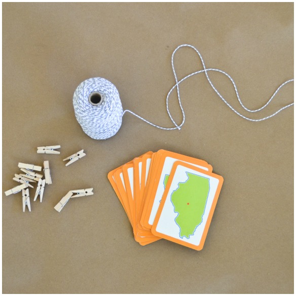 You’ll need flashcards, baker’s twine or string, and mini clothespins.
