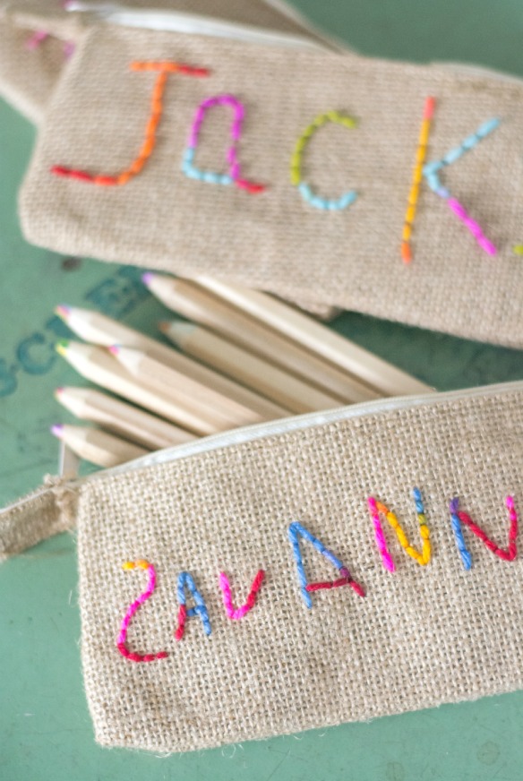 The last few days I’ve been cleaning and purging my craft hoard. I started this the beginning of the year and I’m still pushing through. It’s just not easy letting go of crafts that might of been. While emptying a storage bin yesterday, I came across these burlap zipper pouches. I bought like 20 from the dollar section at Target…2 years ago. I was all set to toss them in the donate pile, when I had a craft vision. We are headed out on a road trip this month and I’ve been gathering supplies to keep the kids occupied. I knew these pouches would be perfect for their coloring pencils and some crayons, but they just needed that special something.
