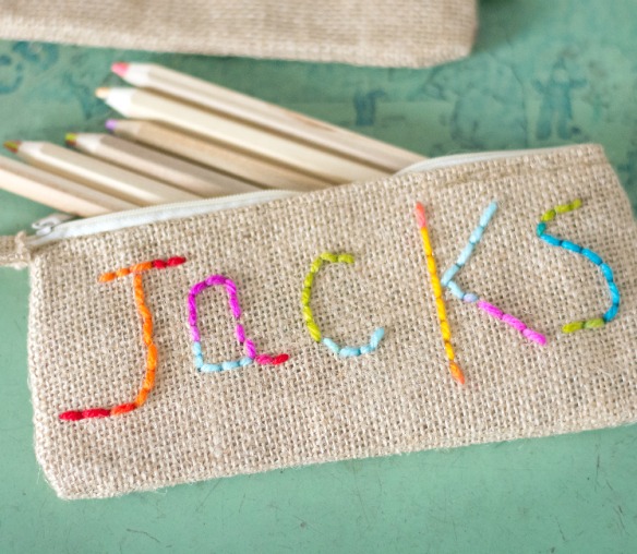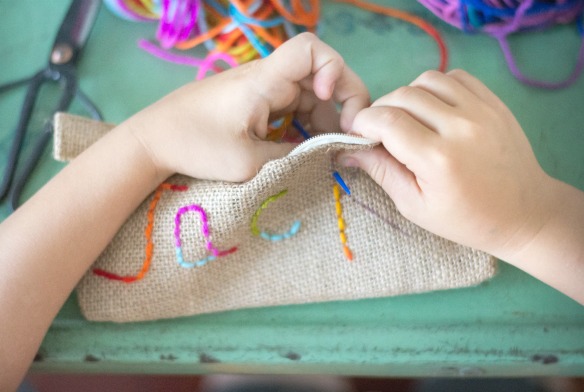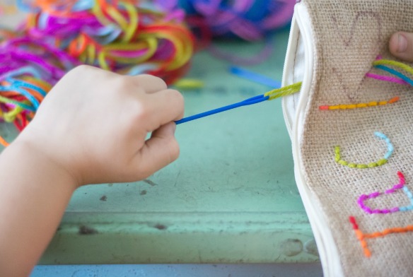 I’ve been wanting to teach them some basic embroidery skills for a while and these pouches were a good starter project. Burlap is great for kid embroidery. The larger holes are easy for them to navigate. Also, you can use yarn, versus thread, which is a little more kid friendly. To start, I had each of them write their name with the sewing marker. Savannah and Annie wrote their names and I did all the stitching for them. I showed Jacks how to thread the needle, then I knotted it for him. I did the first couple of stitches for him, then he finished the rest of his name on his own. I had him stop after each letter and I secured the yarn with a knot on the inside. Just repeat the same steps for each letter.