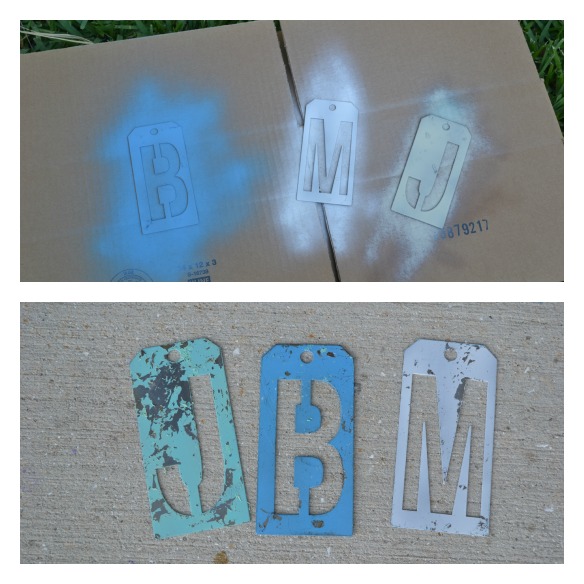 …after drying the letters…I spray painted them in colors I had chosen…then I banged them up a bit. No rules here really. I clanked them together and dropped them on the driveway. Basically…I tumbled them around a bit. I didn’t want a uniform look…so I tumbled some more than others…