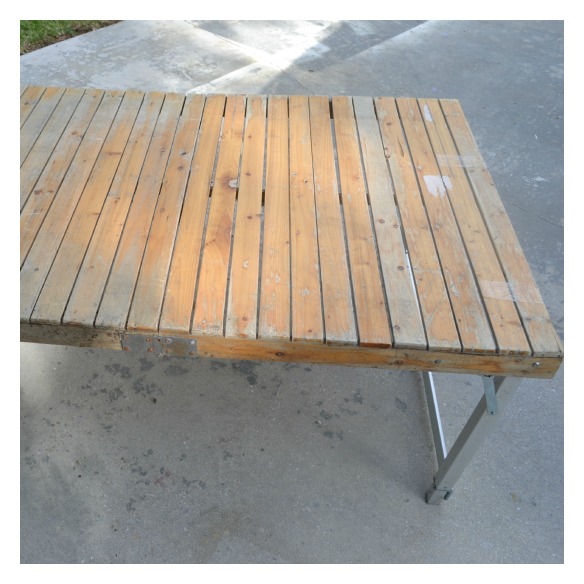 After I had successfully aged all my letters…I repurposed this fold away camping table as my canvas. Found at a local thrift store…I had my husband cut it in half. I left all the hardware intact…as I wanted a real industrial looking piece. Next… I painted and aged it some…then I attached all my letters with roofing nails.