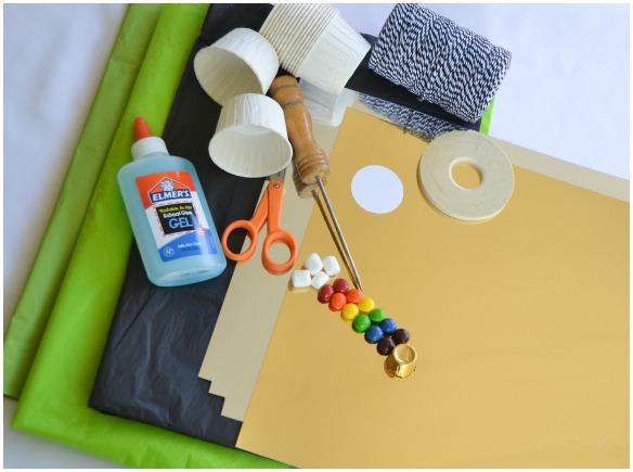 - fill cup with the clouds {mini marshmallows}, rainbow {skittles}, and pot of gold {rolo}.