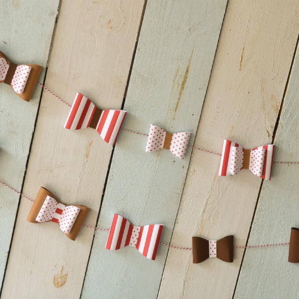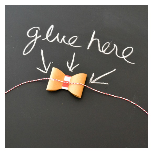 …after you have made the paper bows…space them out and measure how long to cut your twine or ribbon. Make sure to leave extra on the ends for hanging. Next…flip them over and hot glue your twine in the three spots indicated above. Repeat until all bows are attached. That’s it! I told you it was easy!!