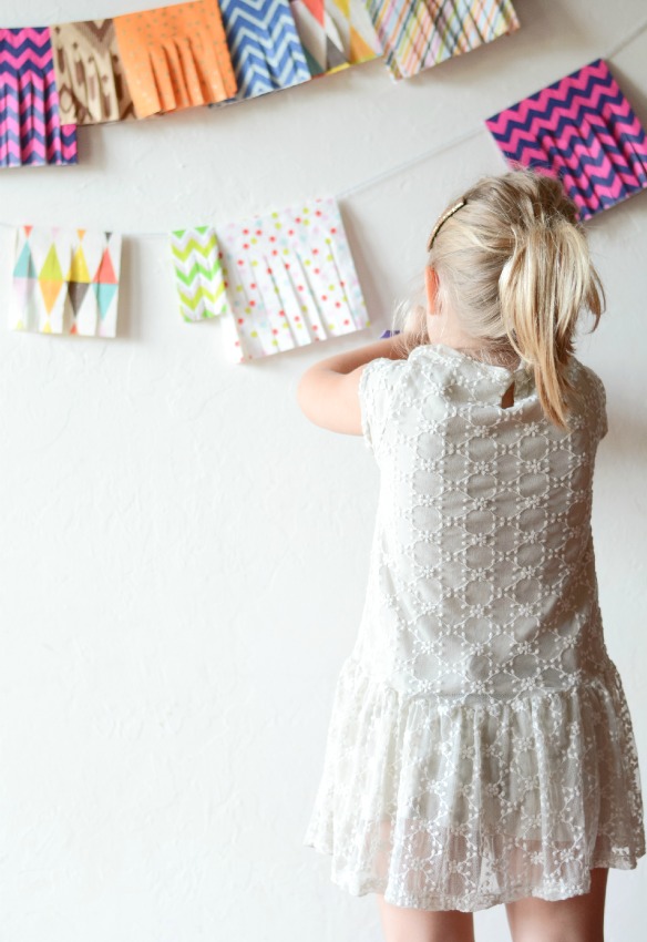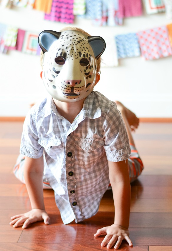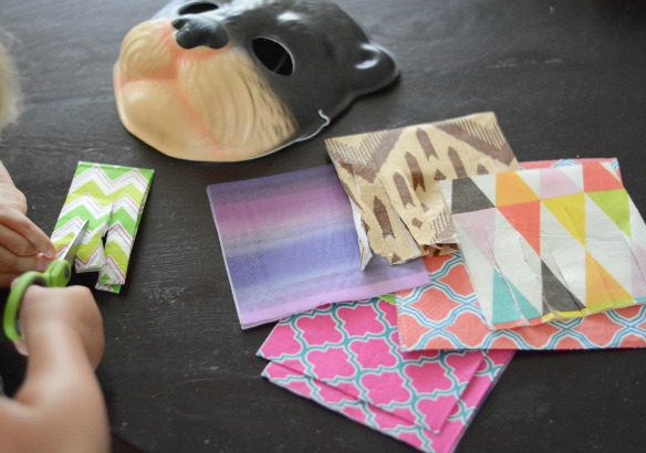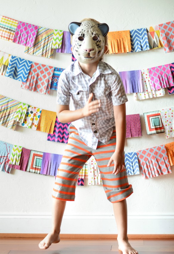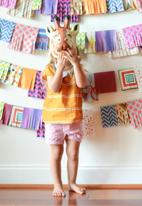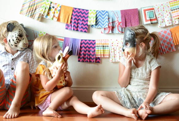 With in the span of a week, all 3 kids have been sick. I thought maybe Savannah had escaped it, but she got sick last night. Thankfully, it’s only been a 24 hour bug for each of them. I thought we could use a little fun, so we crafted ourselves a party napkin garland and danced around in animal masks, because that’s how we roll.
