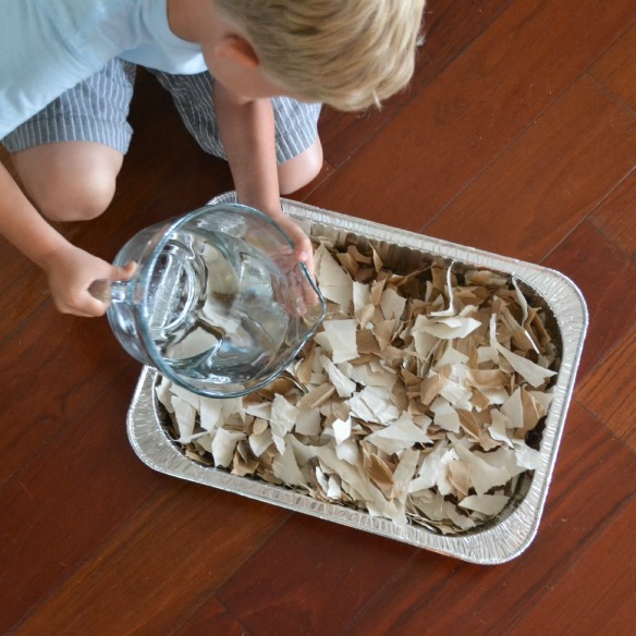 First, tear your paper into small to medium pieces. Pour water over torn paper, covering it completely. I let it sit overnight, but after completing the project, I made the determination it’s not actually necessary.