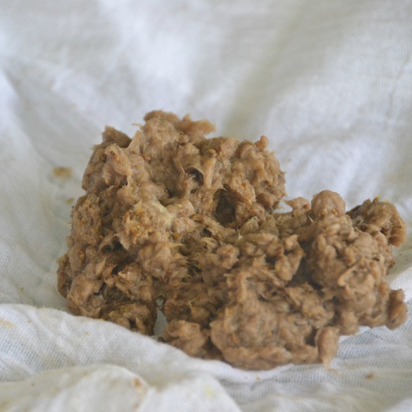 Scoop out some of the seed pulp and place into a flour sack towel. Squeeze the excess water. A lot of tutorials I referenced say to squeeze all the water. However, I found it much easier to work with if it was still a little damp. I will tell you how to remove this excess water in the next step. If it’s too dry, it will just clump and the fibers won’t adhere to each other. Plus, it makes it difficult to manipulate into the cookie cutter.
