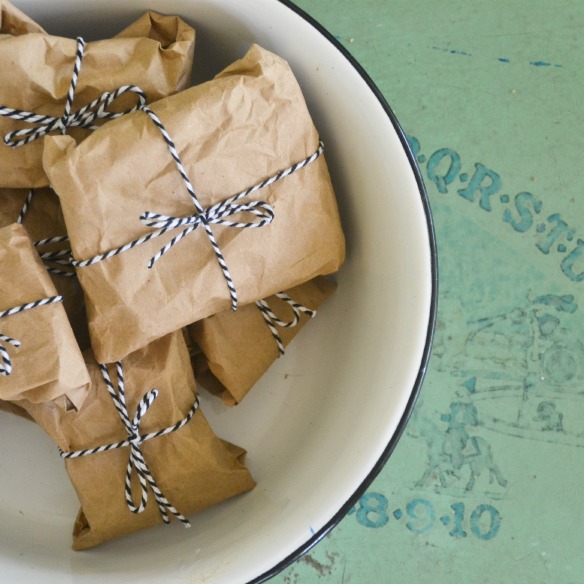 Once they’re completely dry you can package them. I used the same roll of kraft paper and cut pieces {very rudimentary}. Then, I crumbled it in a ball and smoothed back out. Just going for that urban look, you know? I wrote a message with basic instructions, so they weren’t all like…uh…thanks for the letters.