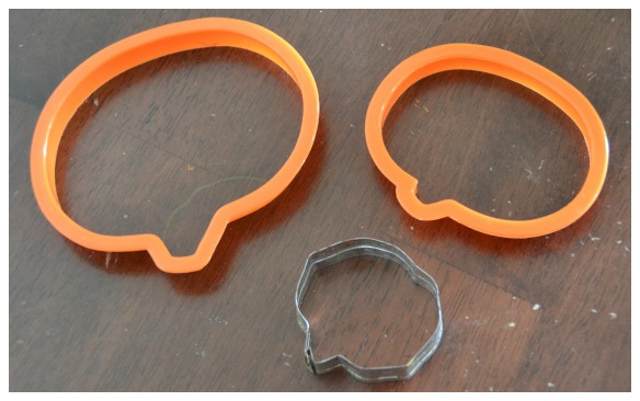 I started thinking of ways I could make one by repurposing a cutter I already own. Sugarbelle does this all the time. She is like the Magyver of cookie cutters. She cuts and pieces and does all kinds of magic cookie stuff. She even did a thought bubble here. For me…it had to be something I didn’t have to piece or hand cut…my cookie skills aren’t that good. So there I was staring at at a box of cookie cutters above my refrigerator. On the side….it has pictures of all the cutters. One in particular caught my eye…the pumpkin! Of course…turn it upside down…instant thought bubble!!! I used a large and a medium. I also stretched out an old mini metal pear cookie cutter. It worked perfect for the small thought bubble.