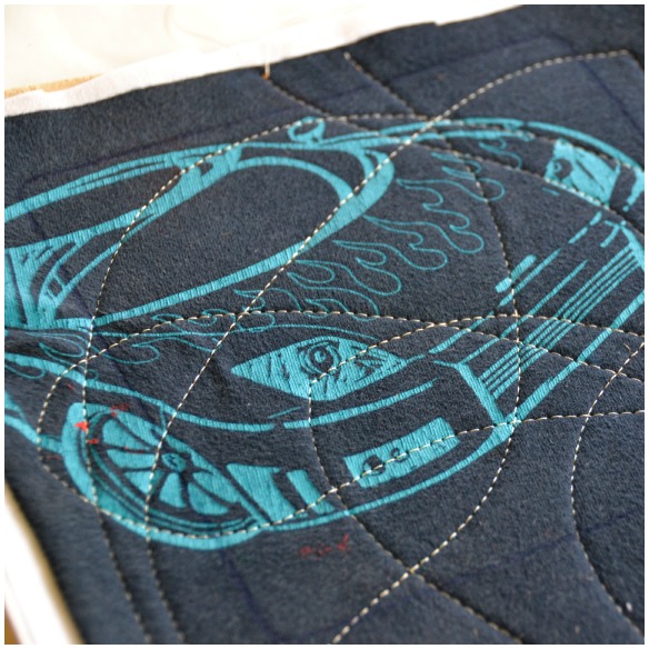 I pinned all four layers of the back cover and crazy quilt stitched it. Just random sewing…no pattern. You just need to keep moving your fabric around until you have one nice quilted piece.
