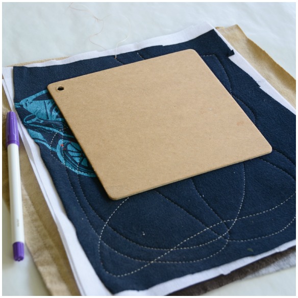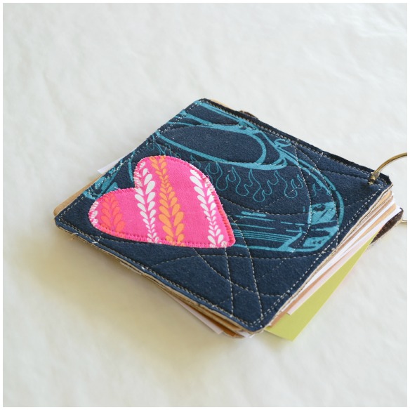I used one of the chipboards as a template. I just placed it over my crazy quilted piece and traced around the perimeter with a fabric marker. Next I cut along the line and then I sewed 2 times around the edge to secure any threads I had cut in the previous step. Once again, I wasn’t worried about straight lines. The more imperfect…the better. Then I appliquéd a heart on the backside to represent my family’s word of the year which is…heart!